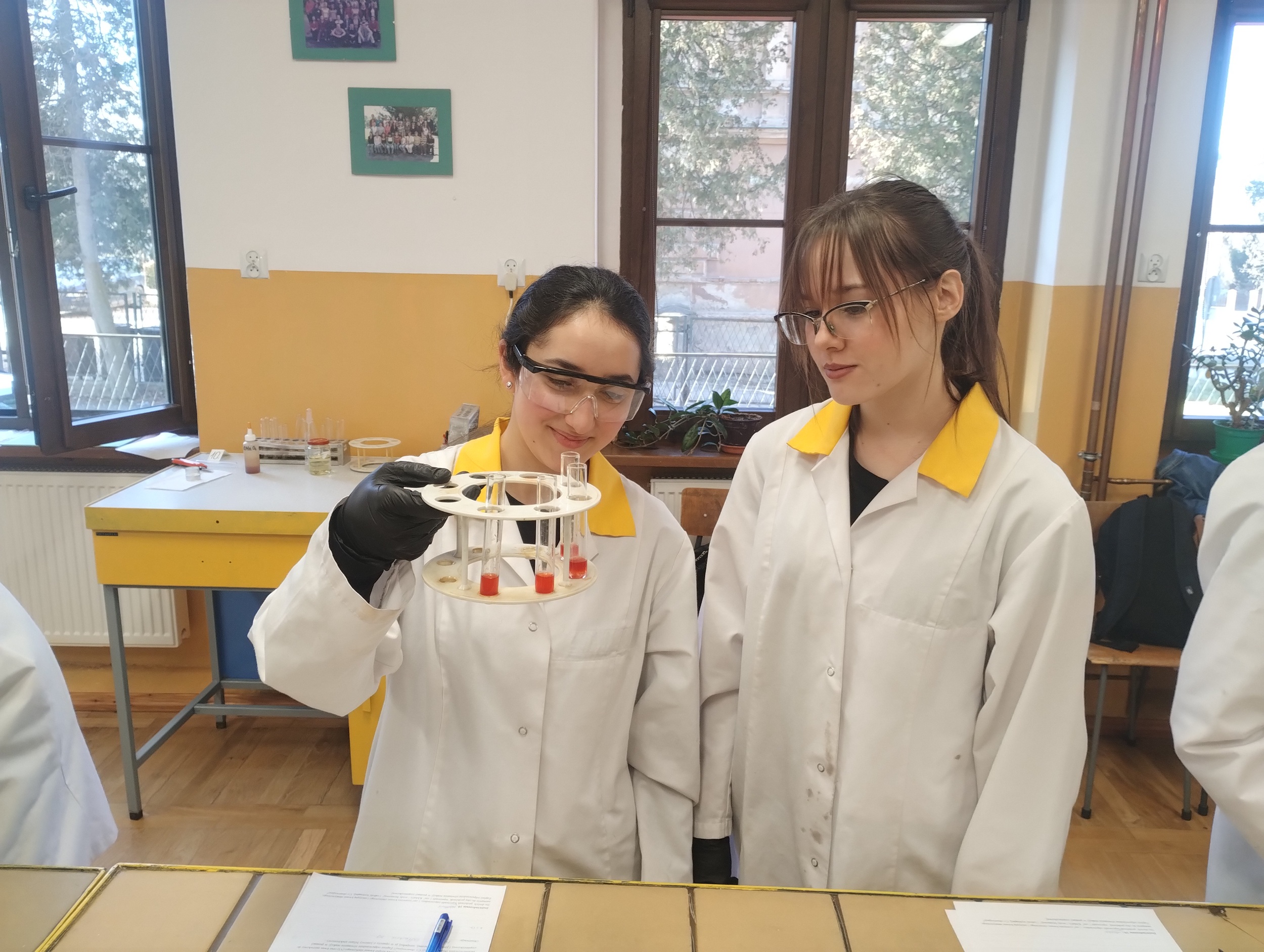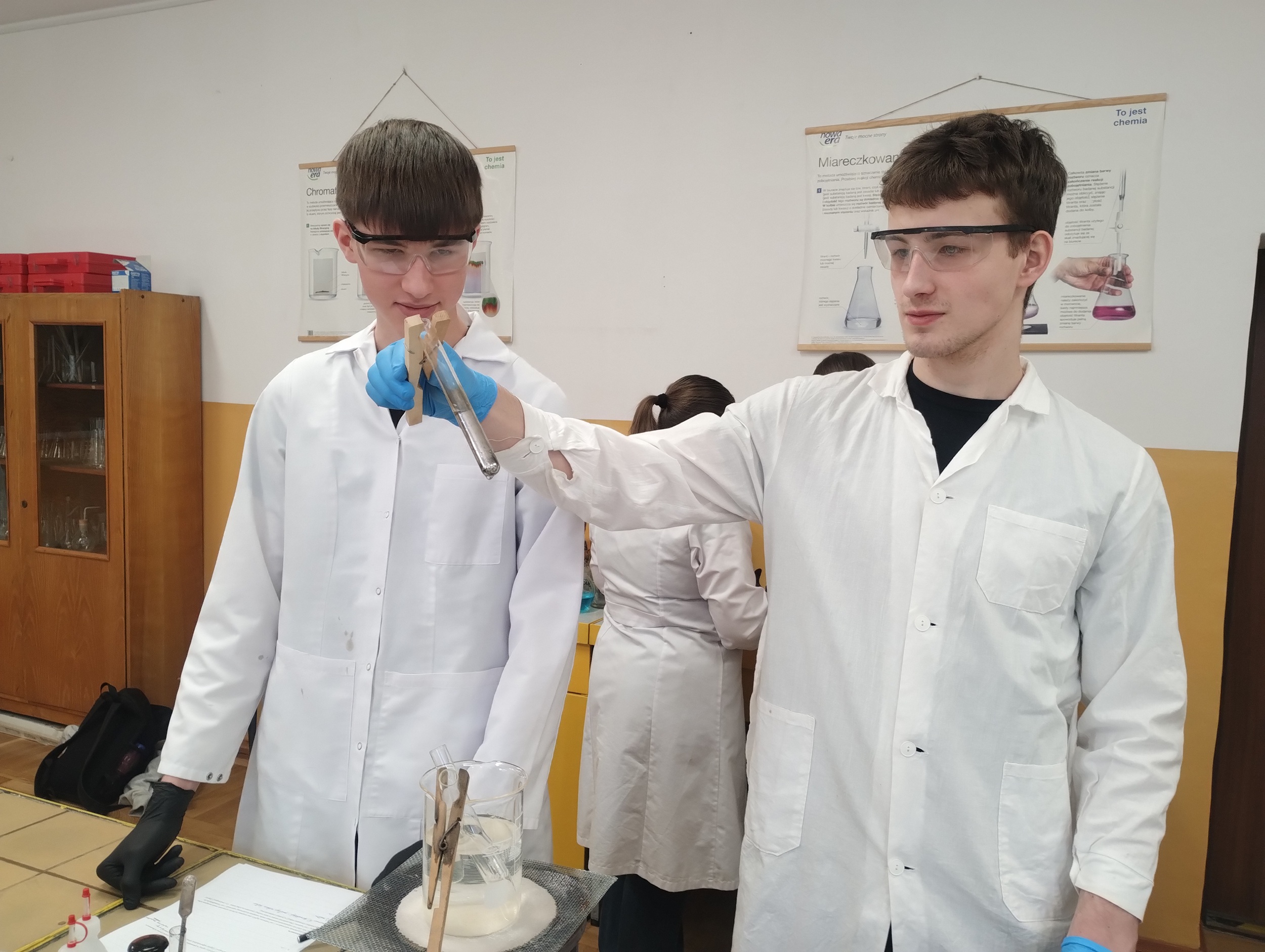 W środę, 4 marca uczniowie klas IIIc i IIIg, w których chemia jest realizowana w zakresie rozszerzonym, uczestniczyli w zajęciach laboratoryjnych poświęconych jednofunkcyjnym pochodnym węglowodorów. Pod czujnym okiem nauczyciela chemii uczestnicy warsztatów samodzielnie wykonali szereg doświadczeń potwierdzających właściwości fizyko-chemiczne grupy związków chemicznych, które powszechnie występują w ich w najbliższym otoczeniu, czyli mydeł, tłuszczów, alkoholi, acetonu i formaldehydu. Zajęcia były dopełnieniem zajęć teoretycznych i doskonałym powtórzeniem przed pracą klasową.