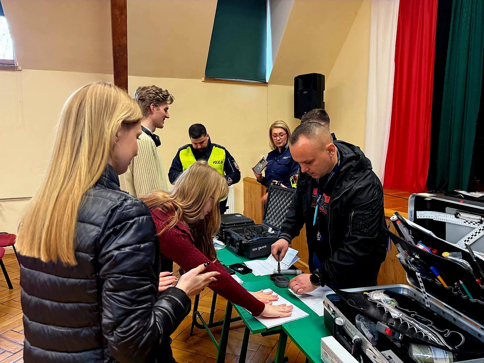 • Technik kryminalistyki zaprezentował specjalistyczny sprzęt i zdradził tajniki zabezpieczania śladów na miejscu zdarzenia. Chętni uczniowie mogli przez chwilę poczuć się jak detektywi, samodzielnie ujawniając i odbijając linie papilarne 🖐️.